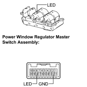 (1) Apply battery voltage to the power window regulator master switch assembly and check that the LED illuminates.