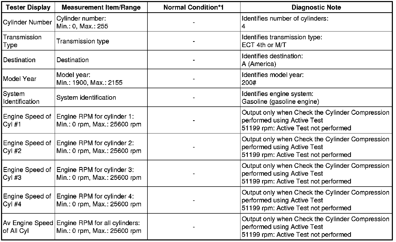 *2: While the Active Test item Check the Cylinder Compression is being performed, the fuel and ignition of all cylinders is cut. At this time, the ECM measures the speed of each cylinder while the engine is being cranked.