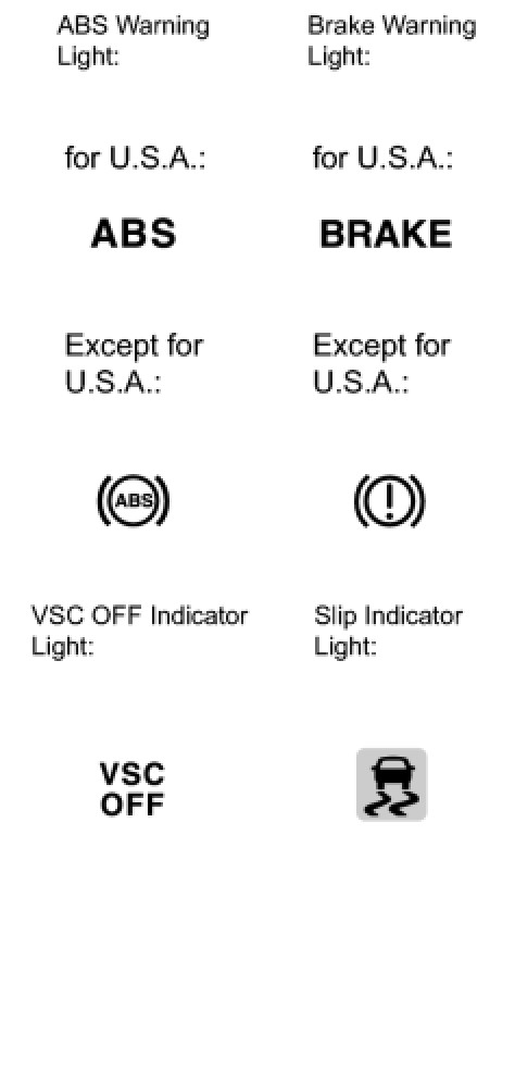 (b) When the ignition switch is turned to ON, check that the ABS warning, brake warning, VSC OFF indicator and slip indicator lights come on for approximately 3 seconds.