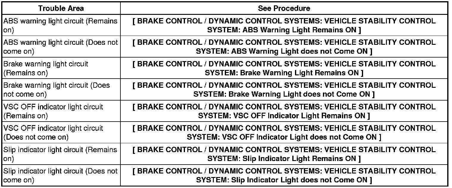 * If the skid control ECU stores any DTCs, the ABS warning, brake warning and slip indicator lights will come on and the VSC OFF indicator light will blink.
