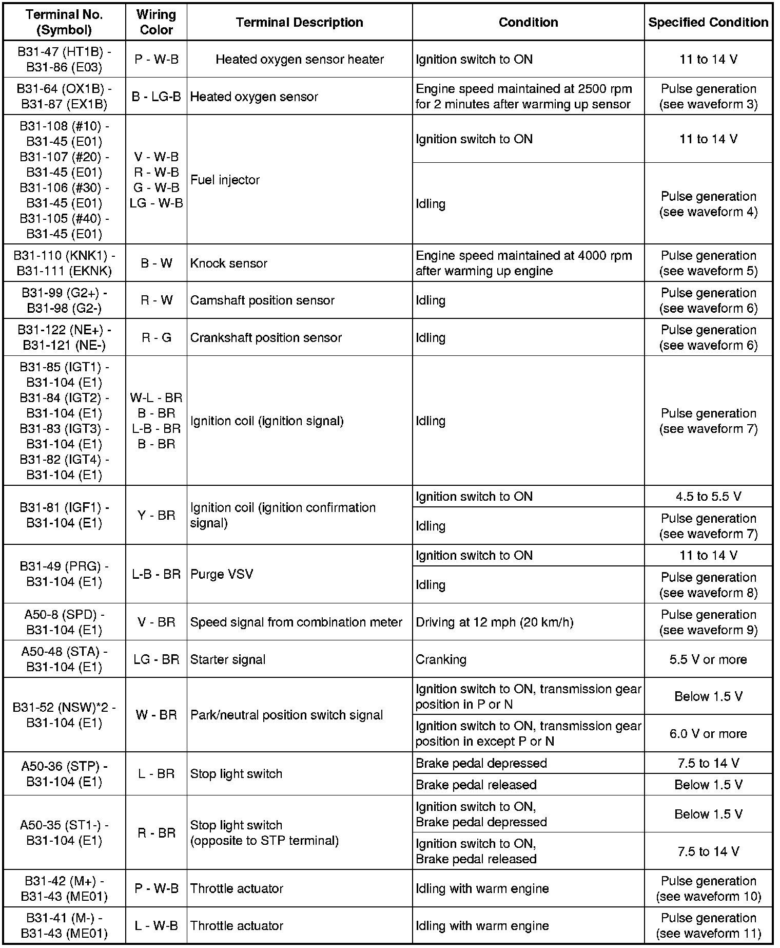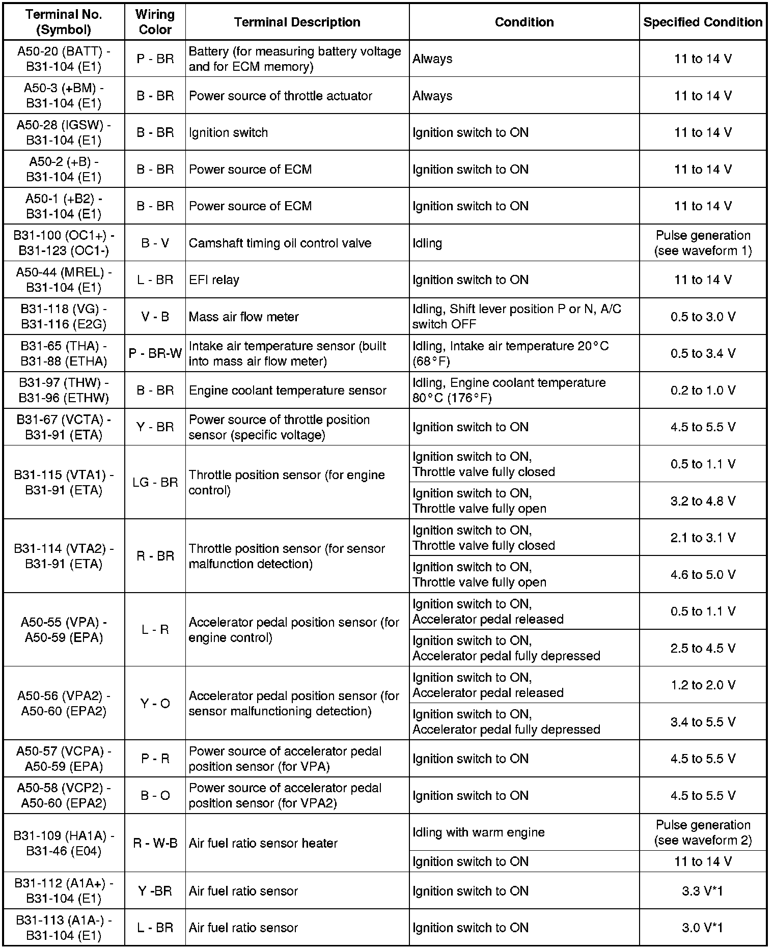 The standard normal voltage between each pair of ECM terminals is shown in the table below. The appropriate conditions for checking each pair of terminals are also indicated. The result of checks should be compared with the standard normal voltage for that pair of terminals, displayed in the Specified Condition column. The illustration above can be used as a reference to identify the ECM terminal locations.