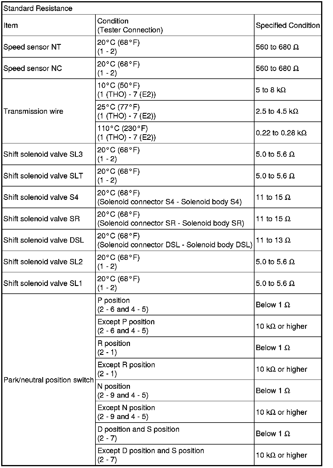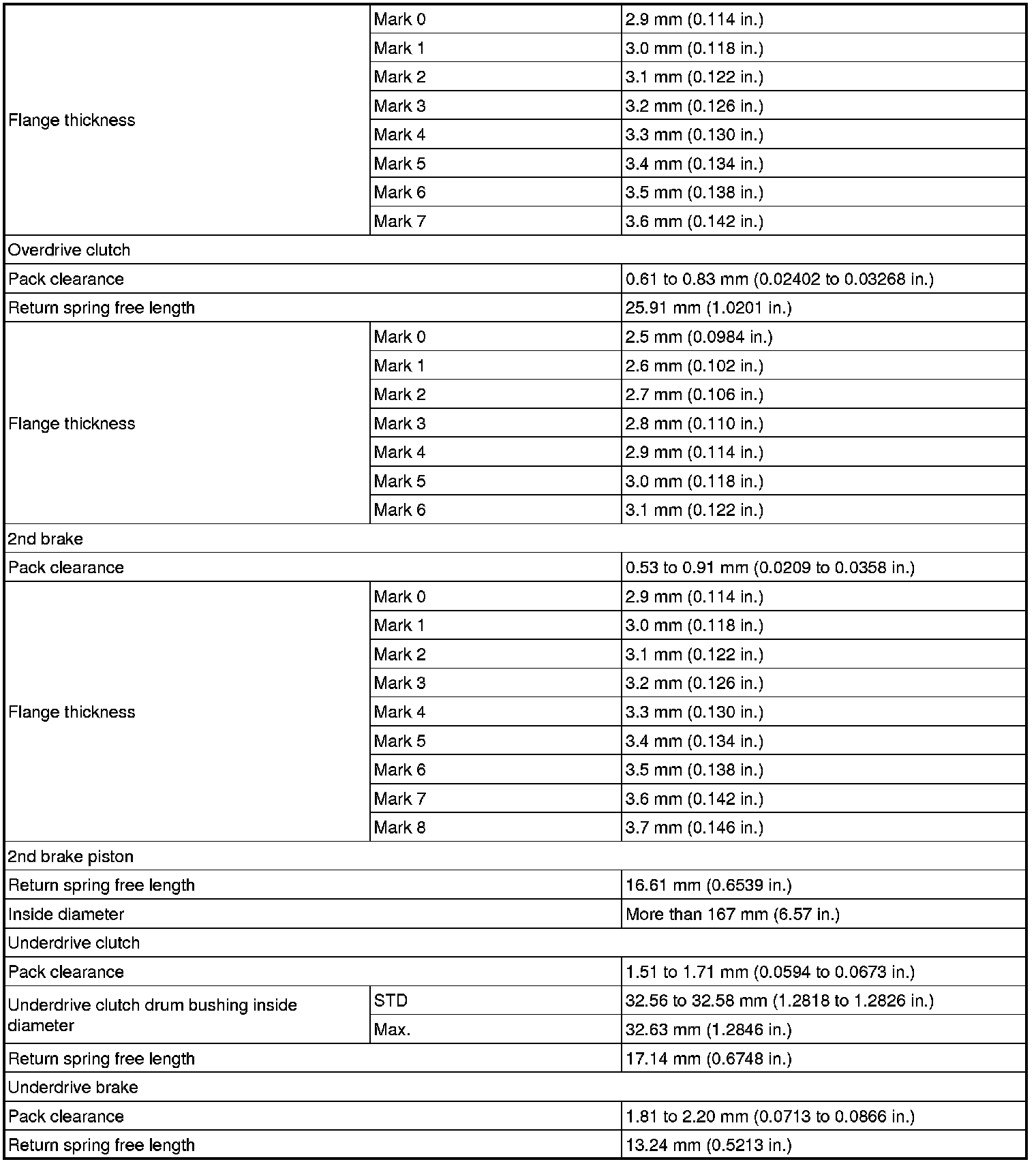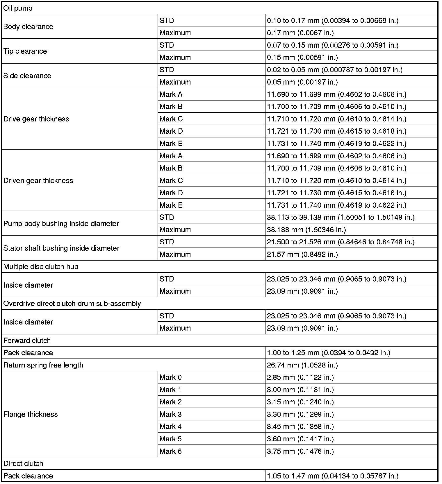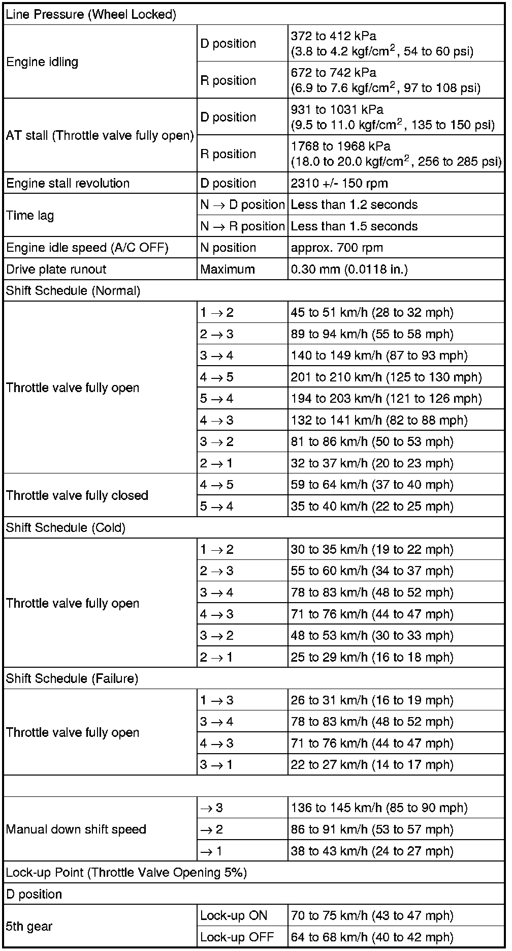 SPECIFICATIONS: U250E AUTOMATIC TRANSMISSION / TRANSAXLE: SERVICE DATA