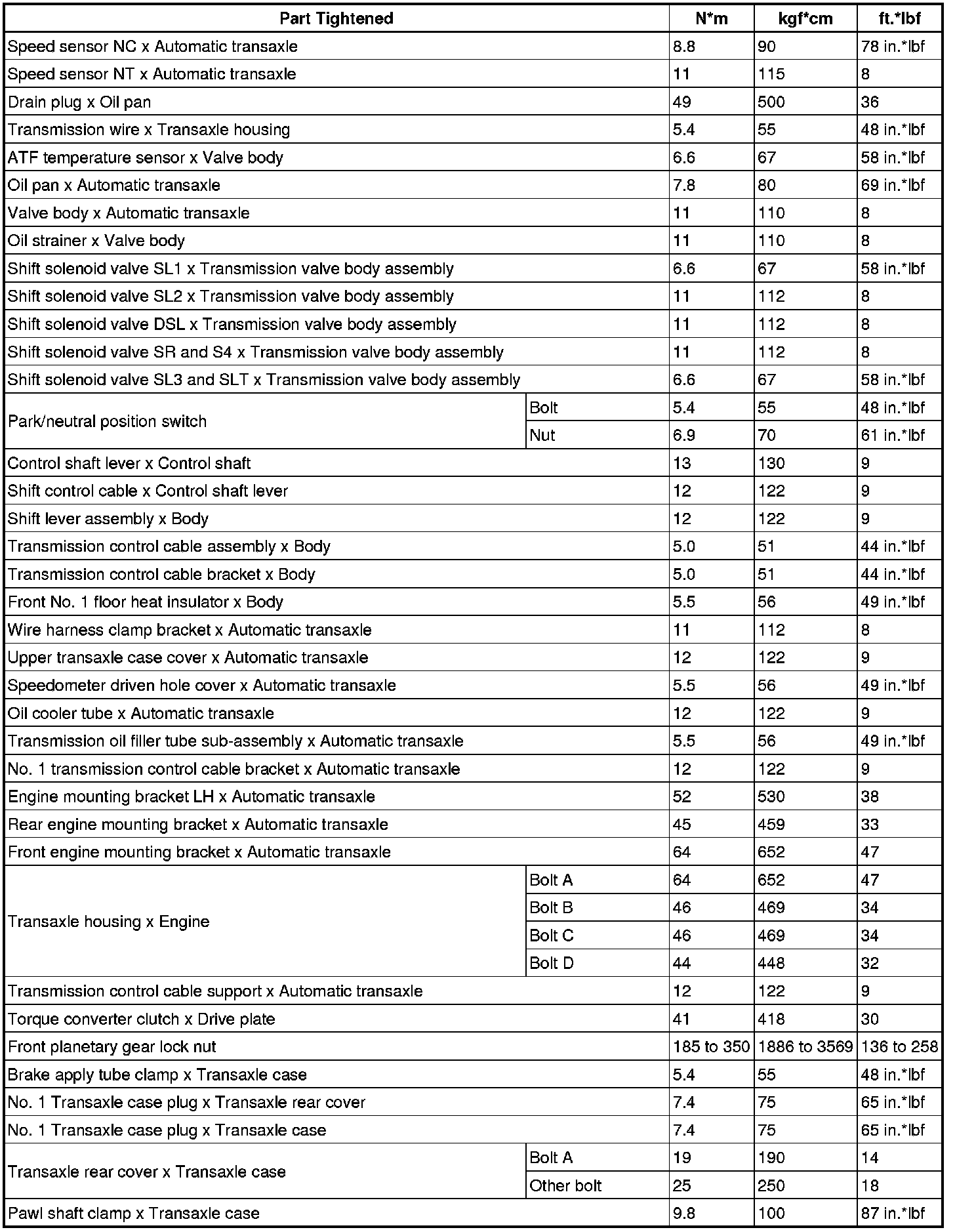 SPECIFICATIONS: U250E AUTOMATIC TRANSMISSION / TRANSAXLE: TORQUE SPECIFICATIONS