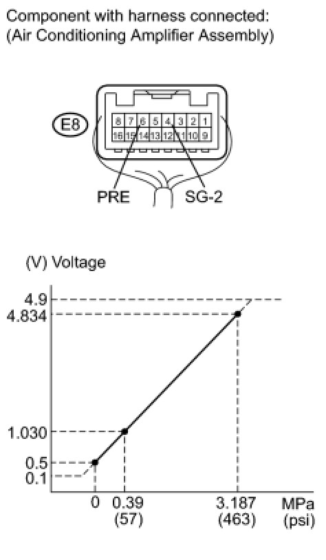 - If refrigerant pressure on the high pressure line becomes extremely high during the inspection (if the voltage exceeds 4.8 V), the fail-safe function stops compressor operation. Therefore, measure the voltage before the fail-safe function operates.