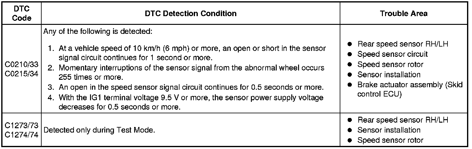 * DTCs C0210/33 and C1273/73 are for the rear speed sensor RH.