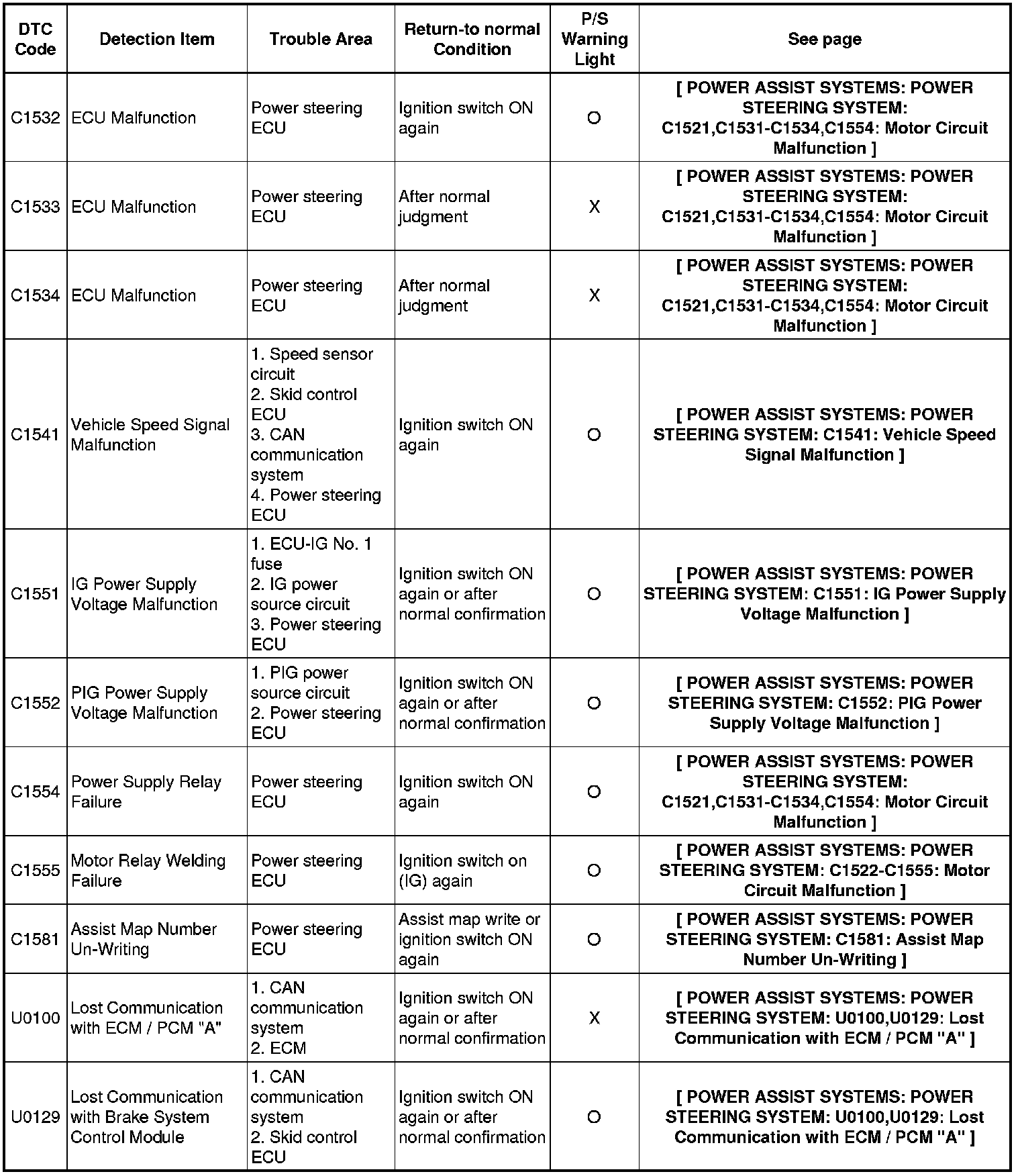 POWER ASSIST SYSTEMS: POWER STEERING SYSTEM: DIAGNOSTIC TROUBLE CODE CHART