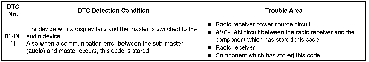 *1: When 210 seconds have elapsed after disconnecting the power supply connector of the master component with the ignition switch ON or ACC, this code is stored.