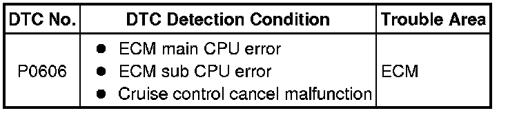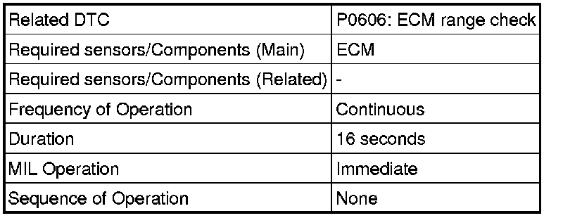 The ECM continuously monitors its main and sub CPUs. This self-check ensures that the ECM is functioning properly. If outputs from the CPUs are different and deviate from the standards, the ECM will illuminate the MIL and set the DTC immediately.