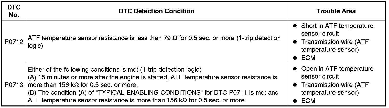 These DTCs indicate an open or short in the automatic transmission fluid (ATF) temperature sensor (TFT sensor) circuit. The automatic transmission fluid (ATF) temperature sensor converts ATF temperature to an electrical resistance value. Based on the resistance, the ECM determines the ATF temperature, and the ECM detects an opens or shorts in the ATF temperature circuit. If the resistance value of the ATF temperature is less than 79 Ohms *1or more than 156 kOhms *2, the ECM interprets this as a fault in the ATF sensor or wiring. The ECM will turn on the MIL and store the DTC.