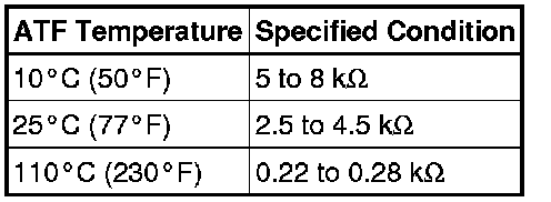 If the resistance is out of the specified range with either the ATF temperature shown in the table below, the driveability of the vehicle may decrease.