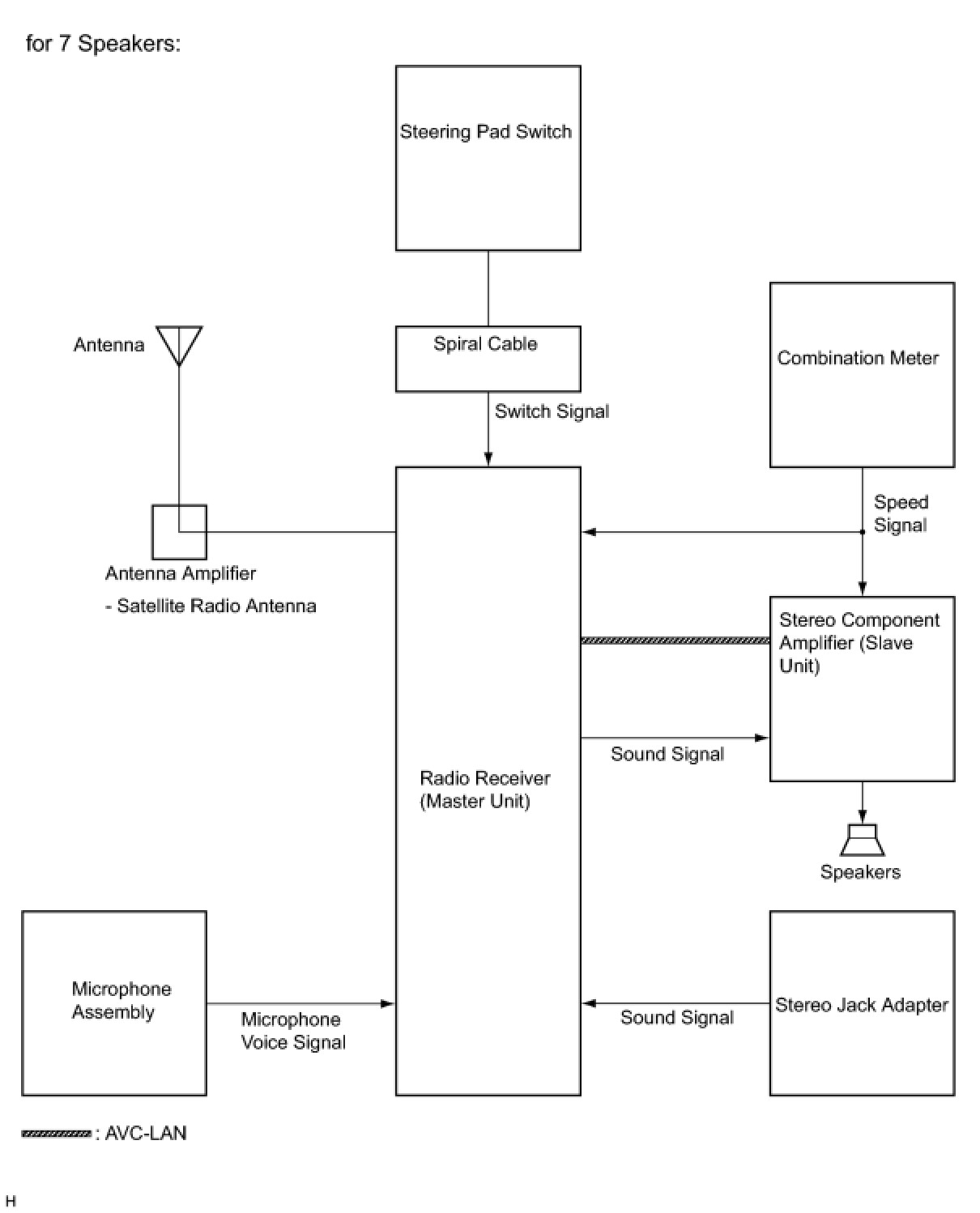 (b) AVC-LAN, an abbreviation for "Audio Visual Communication Local Area Network", is a united standard developed by the manufacturers in affiliation with Toyota Motor Corporation. This standard pertains to audio and visual signals as well as switch and communication signals.