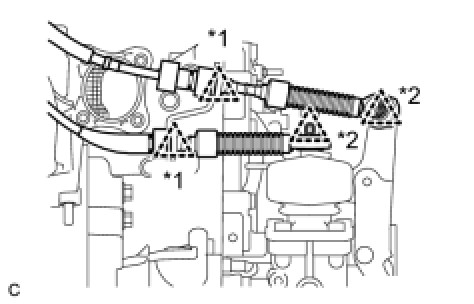 (b) Install the 2 transmission control cables to the transaxle with 2 new clips*2.