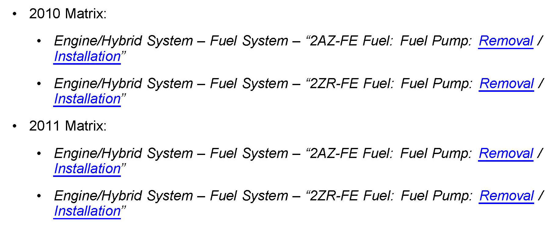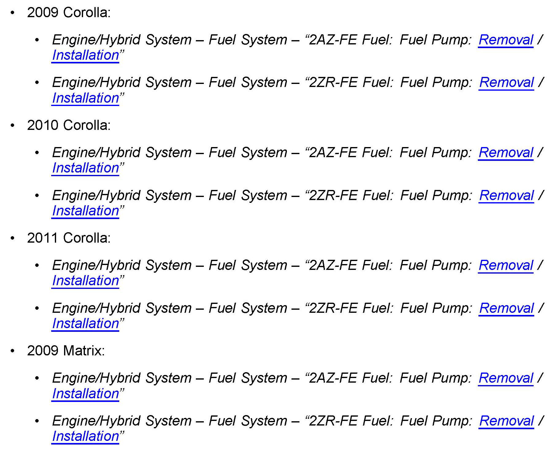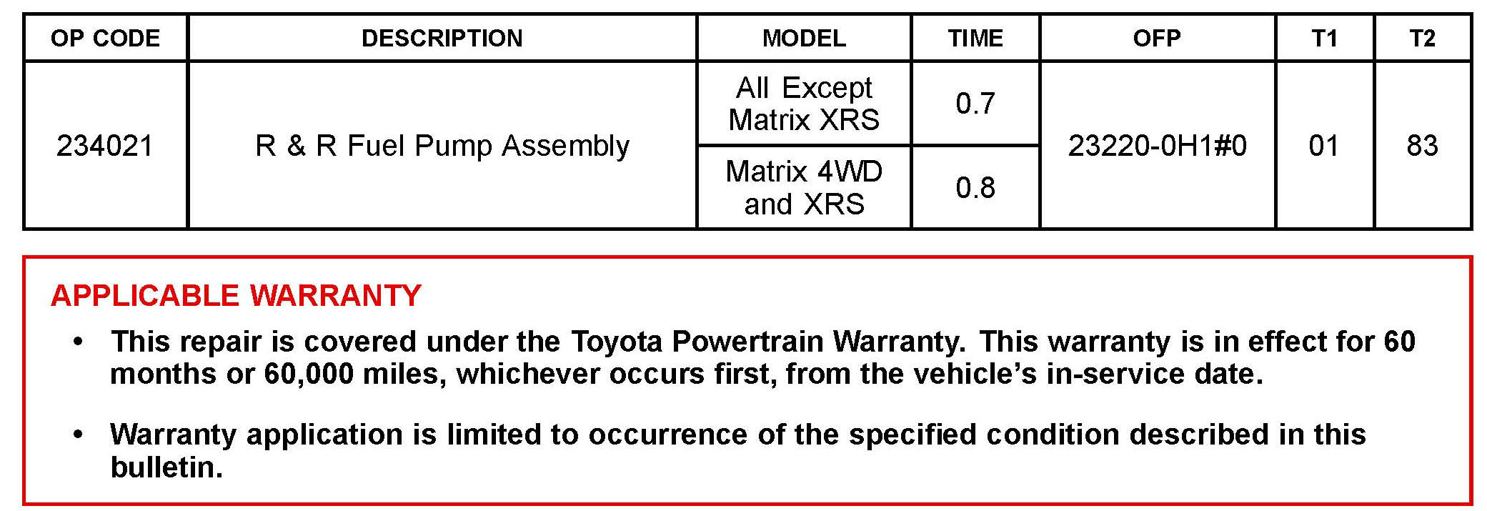 Some 2009 - 2011 model year Corolla or Matrix vehicles may exhibit a temporary extended crank condition when attempting to start the vehicle following operation in high altitude high temperature and high vehicle load conditions. Replace the fuel pump to address this condition.