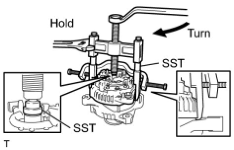 (f) Loosen the pulley by turning SST (B) in the direction shown in the illustration.