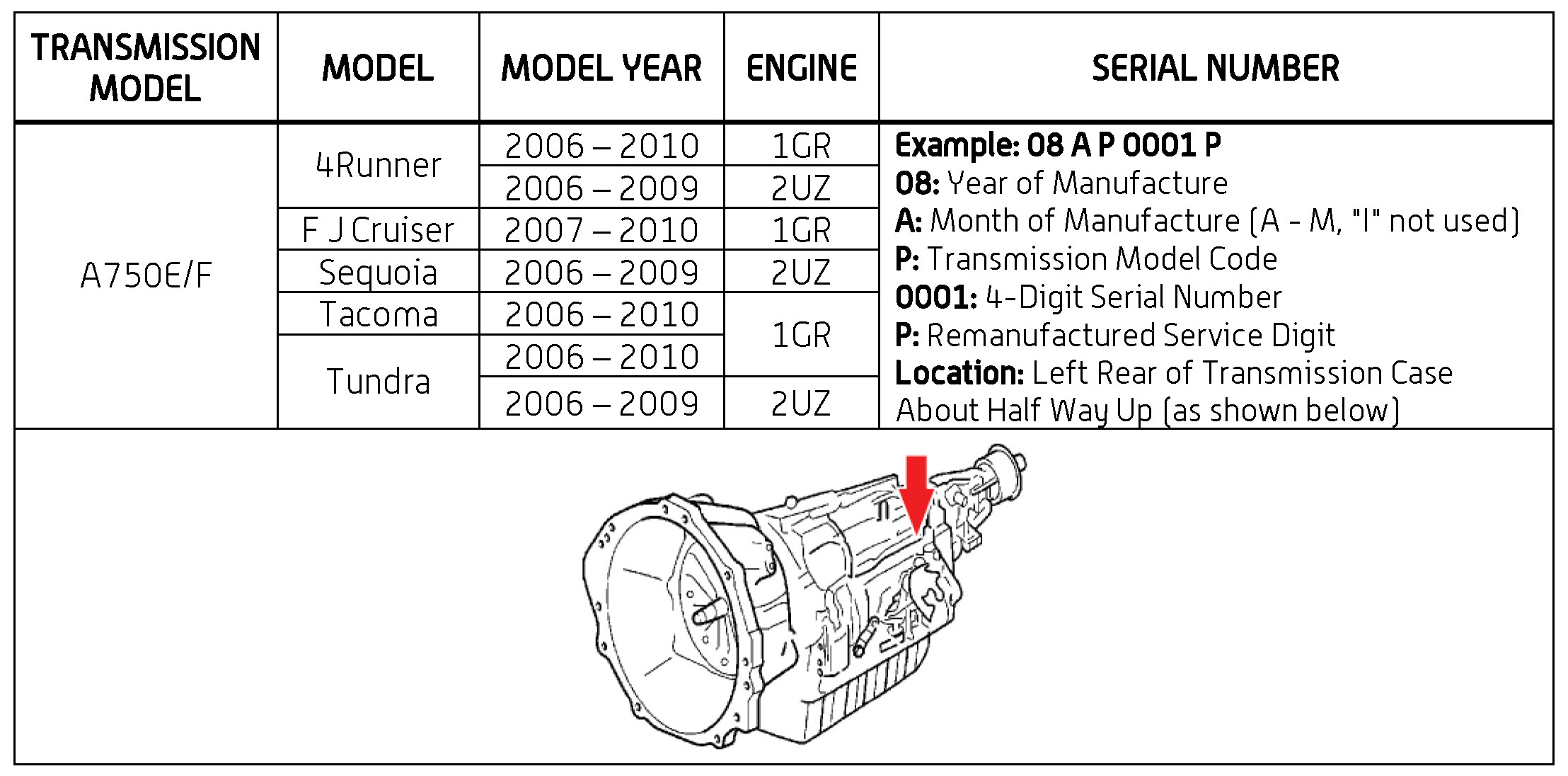 REMANUFACTURED AUTOMATIC TRANSMISSION SERIAL NUMBER LOCATION