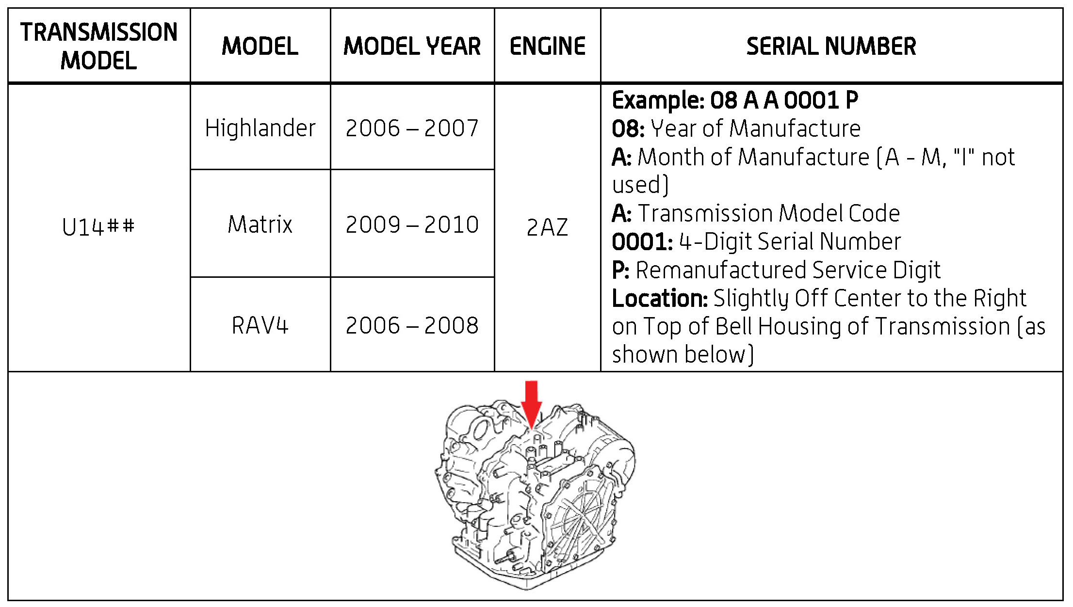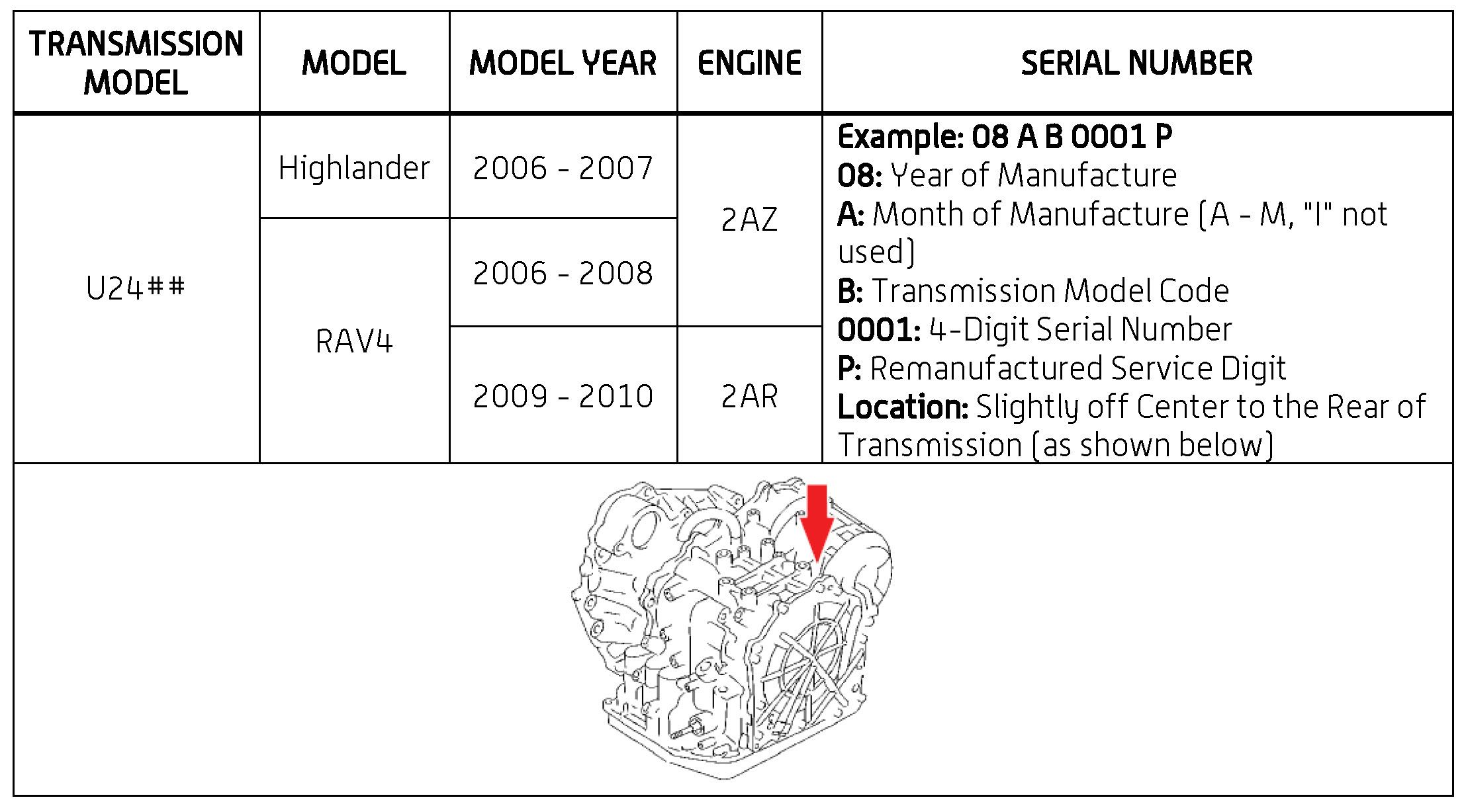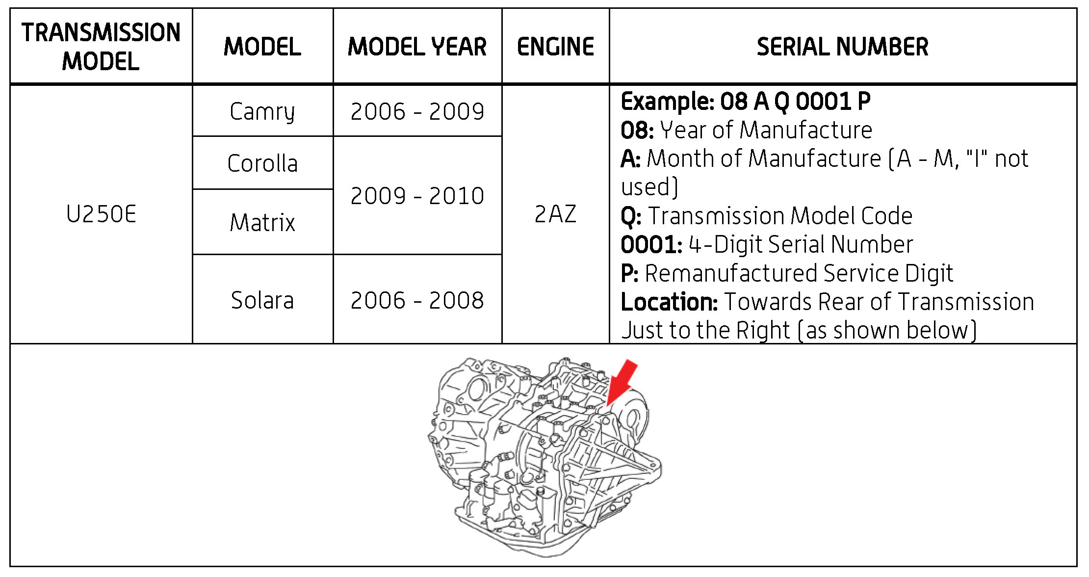 The purpose of this TSB is to assist in the identification and location of serial numbers on 2006 - 2010 model year remanufactured automatic transmissions.