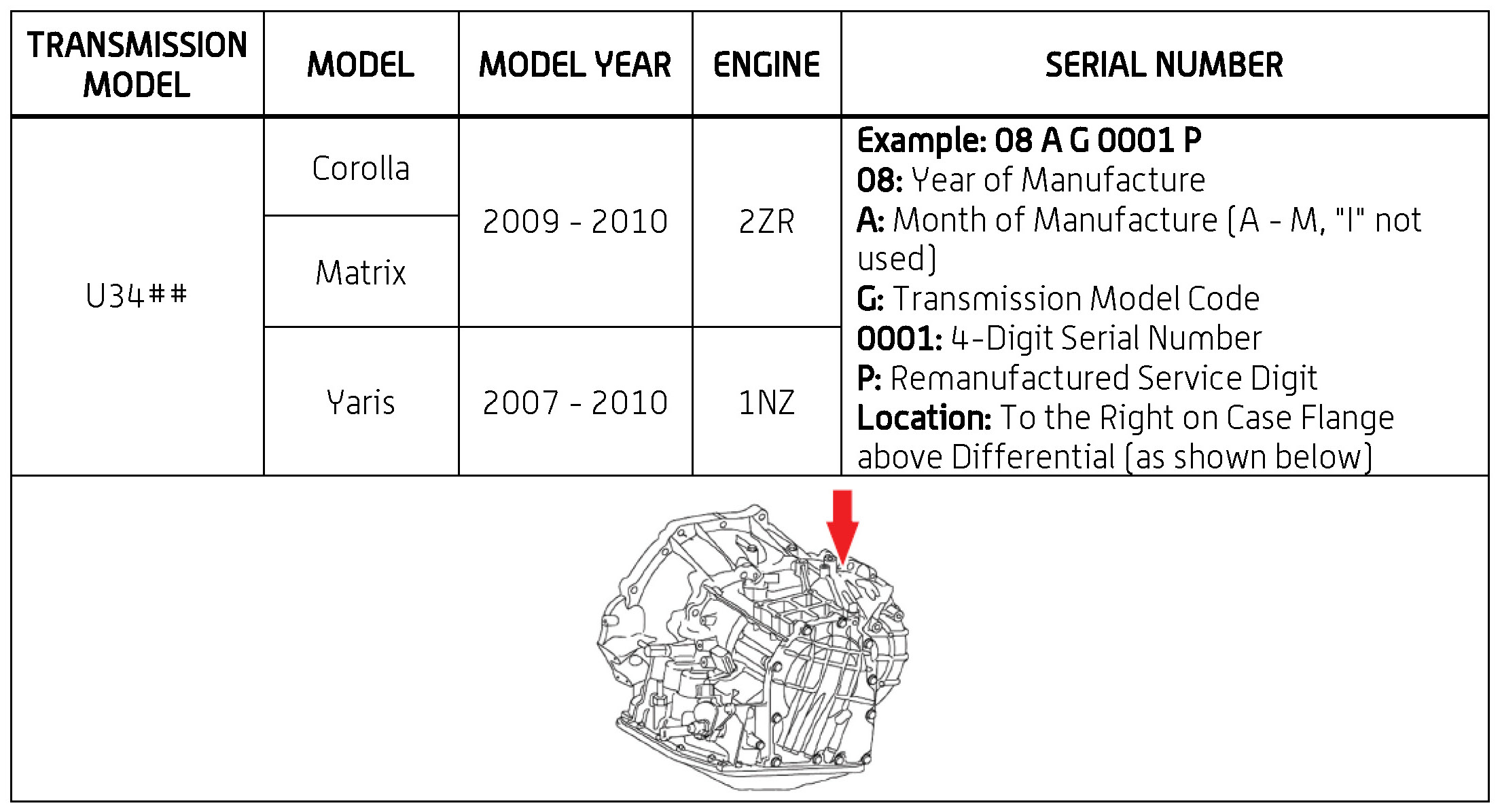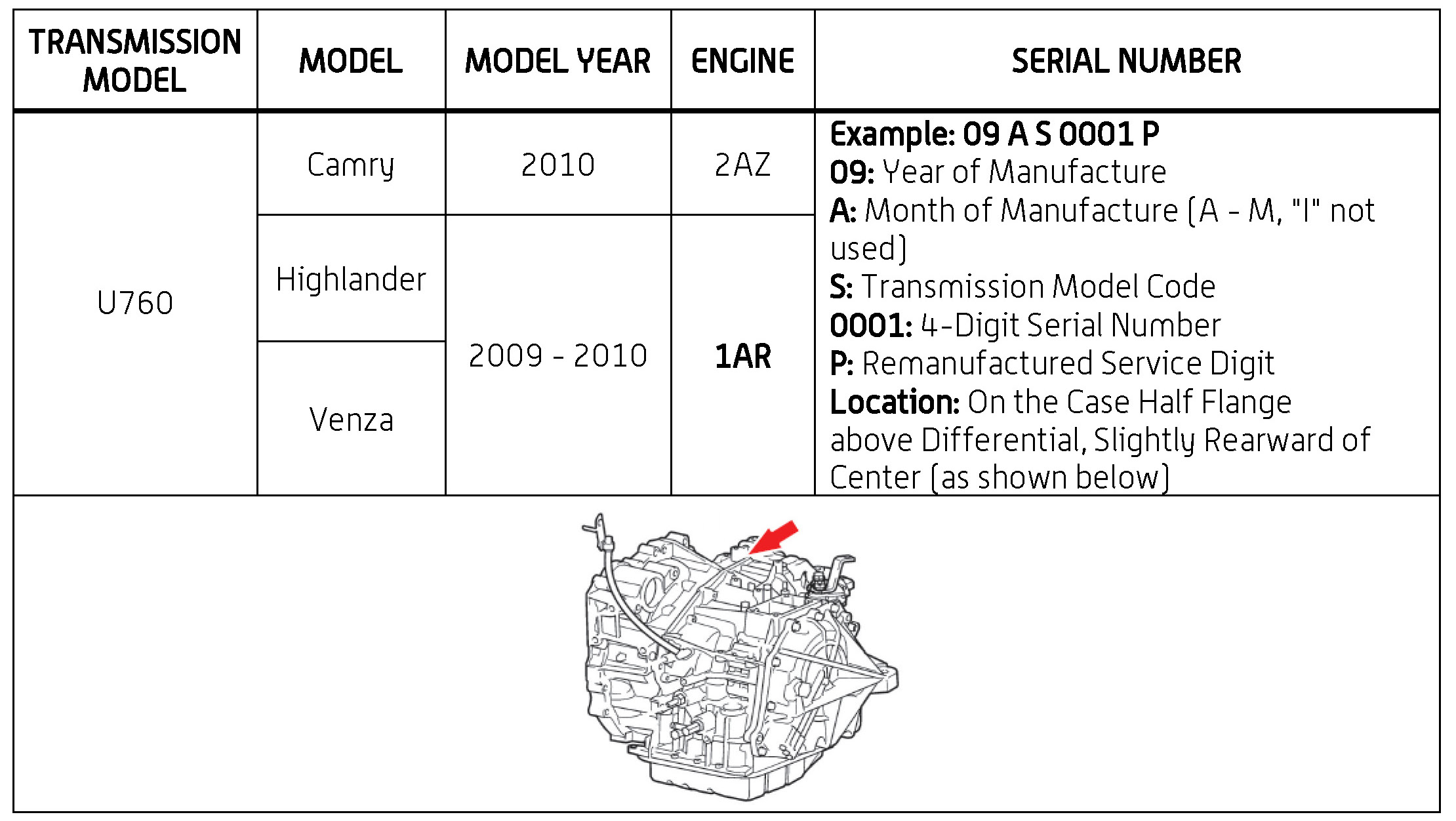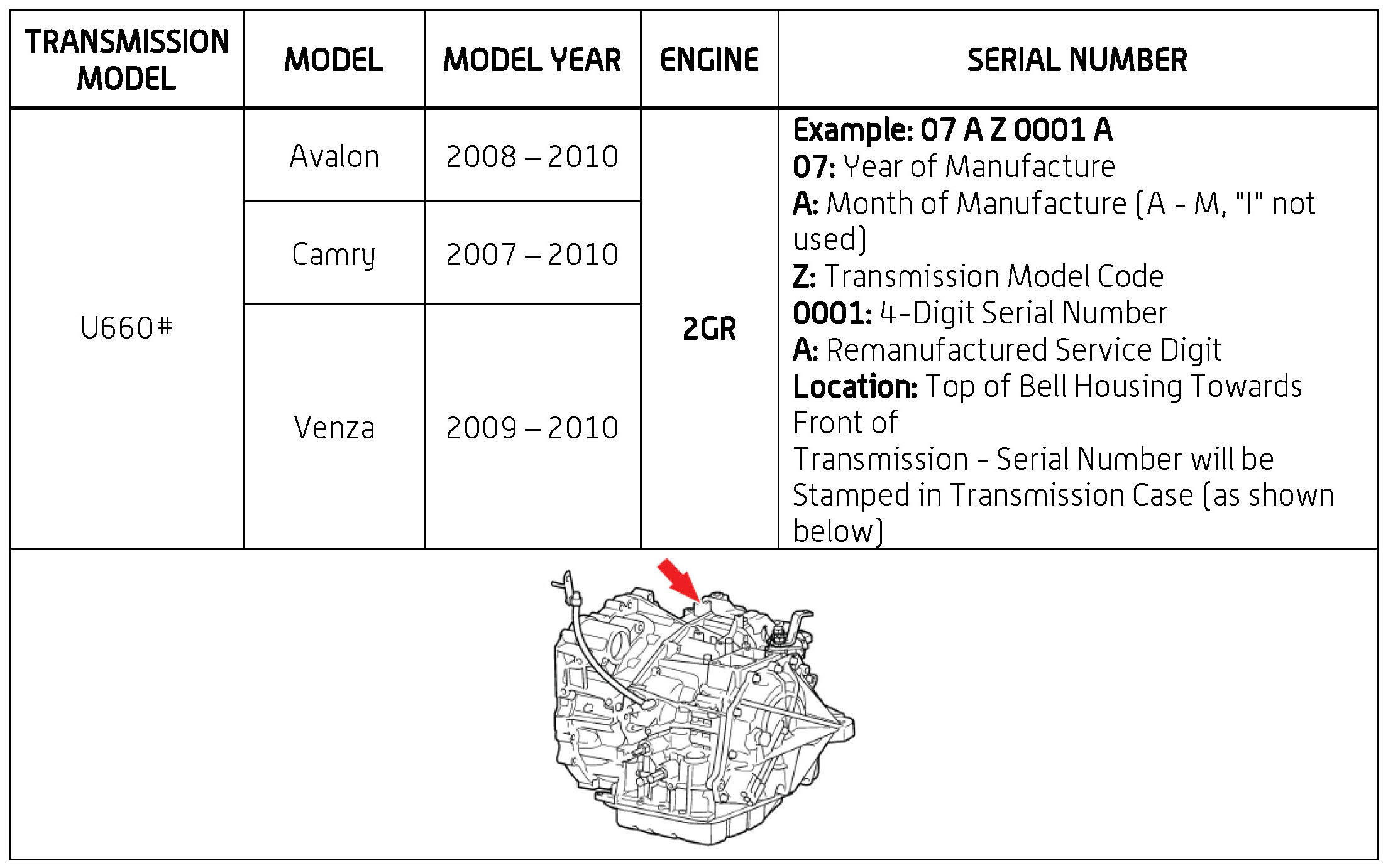 The purpose of this TSB is to assist in the identification and location of serial numbers on 2006 - 2010 model year remanufactured automatic transmissions.