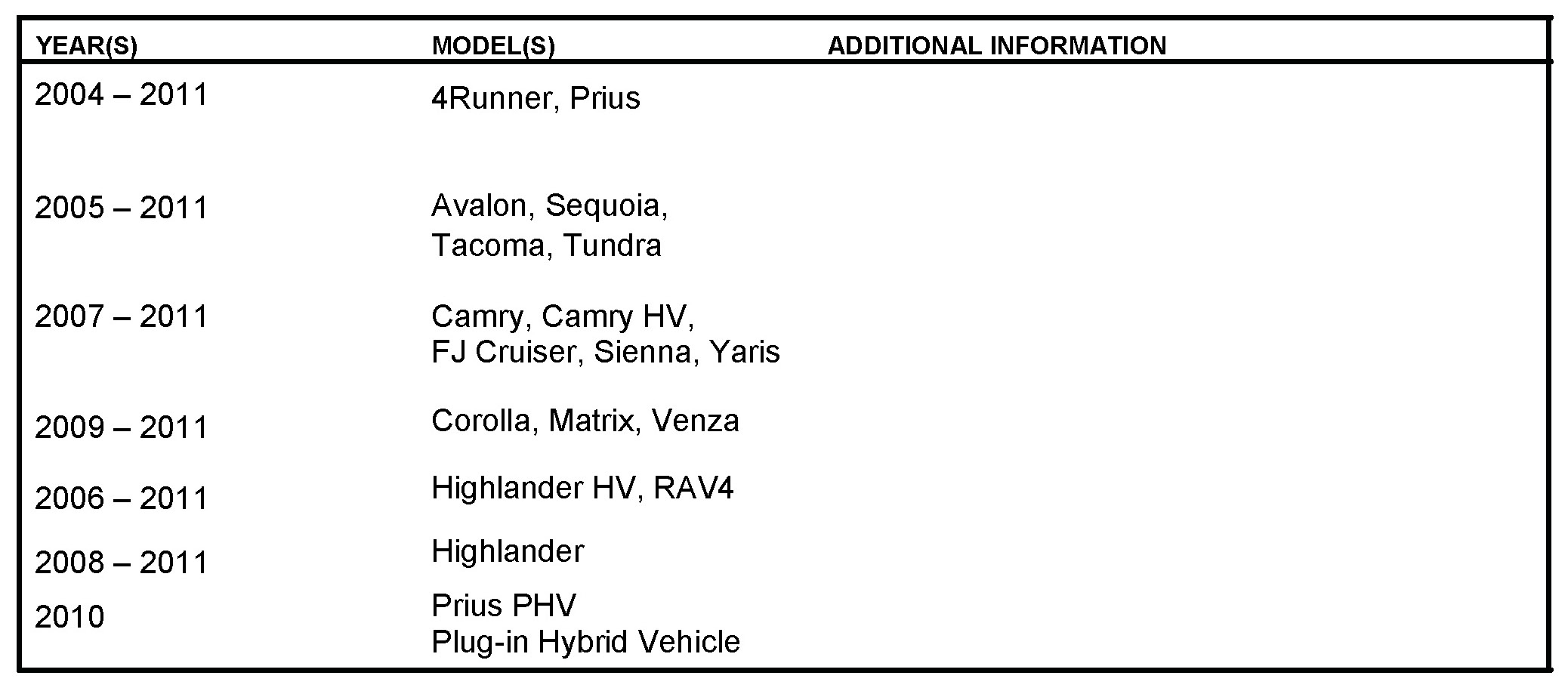 - Applicability has been updated to include 2009 - 2011 model year Toyota vehicles.