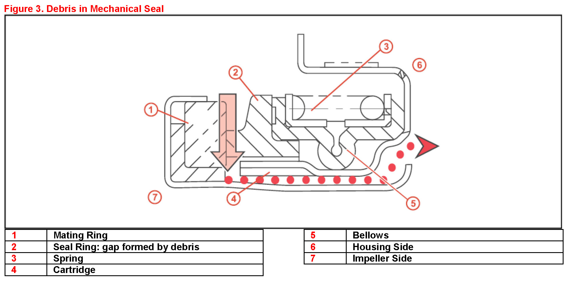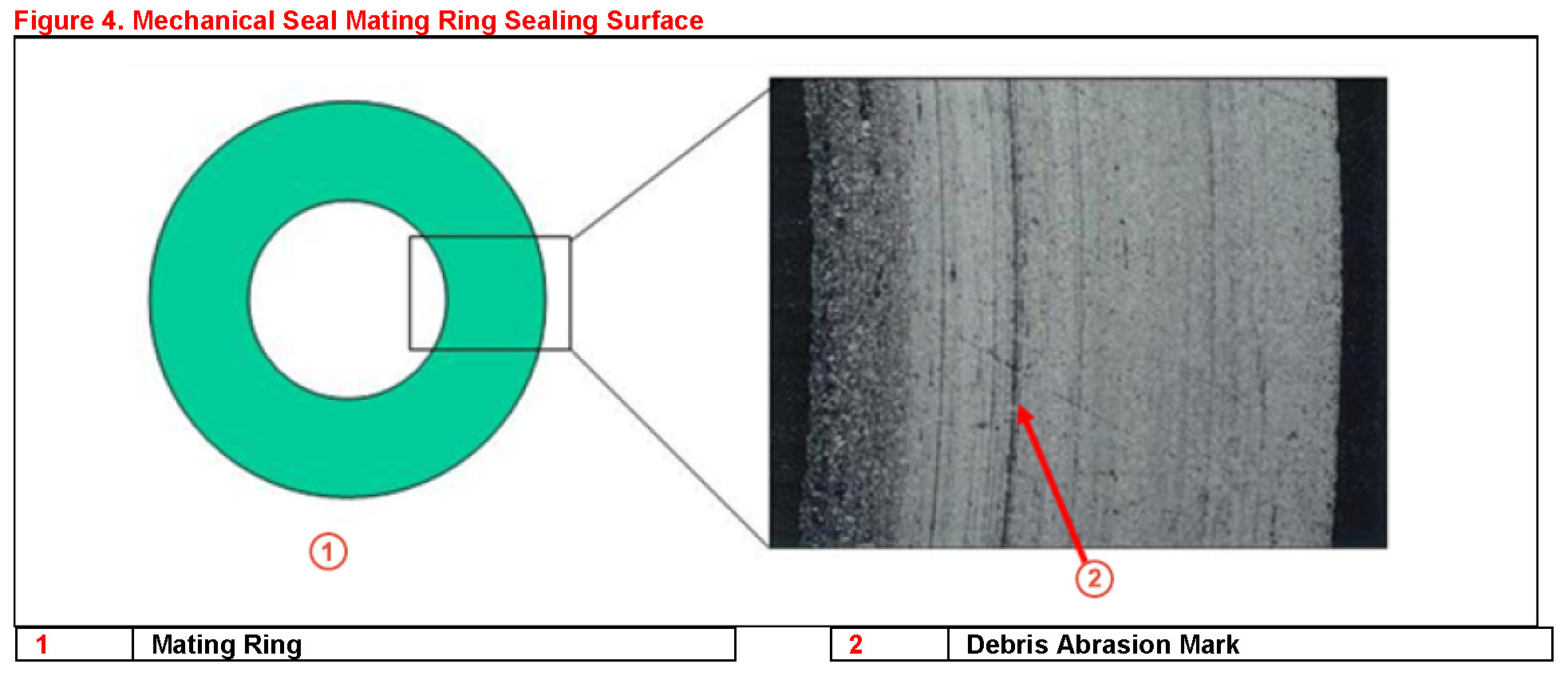 If debris was trapped between the seal ring and mating ring an abrasion mark may have been left on the mating ring surface. This abrasion mark does not affect sealing performance due to the large sealing surface of the mating ring. Once the debris is no longer present the mechanical seal performance will return to normal operation. Water pump replacement is not necessary.