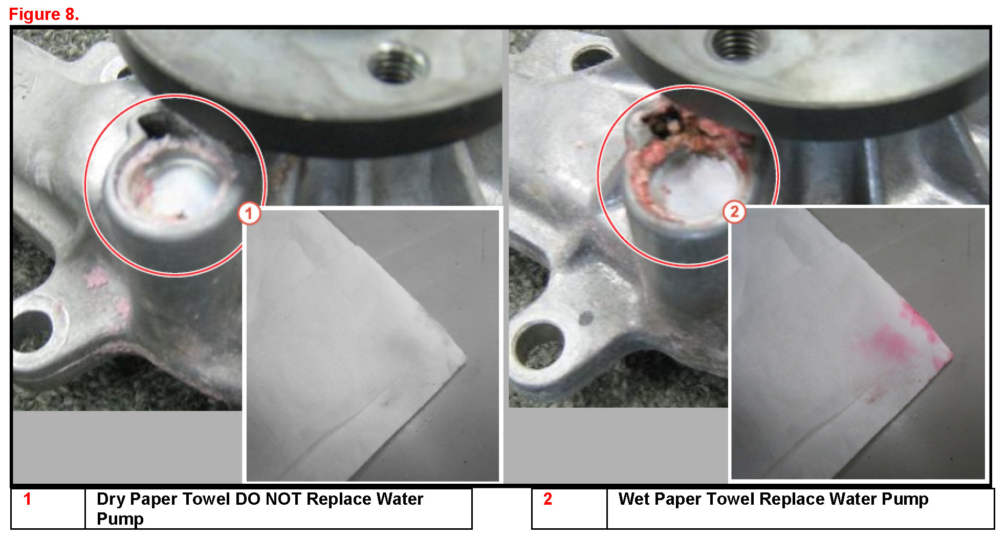 3. Apply a dry paper towel to the coolant deposits around the weep hole. If the paper towel remains dry the leak was temporary and the water pump does not need to be replaced. If the paper towel becomes wet the leak is current and the water pump should be replaced.