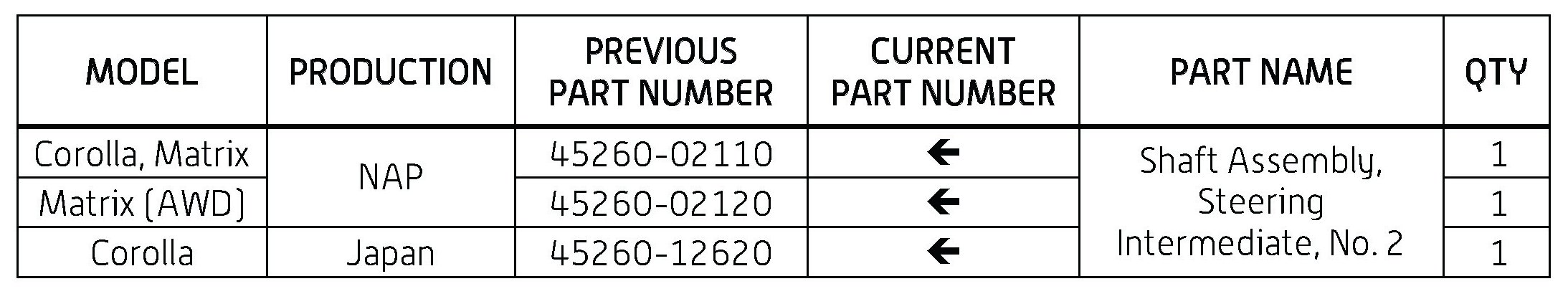 Some 2009 - 2010 Corolla and Matrix vehicles may exhibit a clunk, pop, or knocking noise when turning the steering wheel to the left or right. A new intermediate shaft has been developed to address this condition. Use the following repair procedure to remove and replace the steering intermediate shaft.