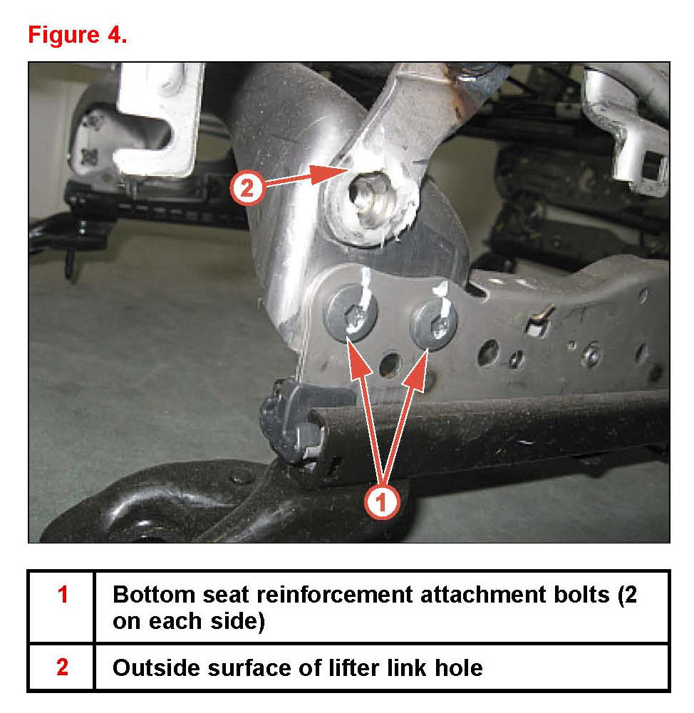 8. Install and finger tighten the 4 bottom seat reinforcement attachment bolts (2 on each side).