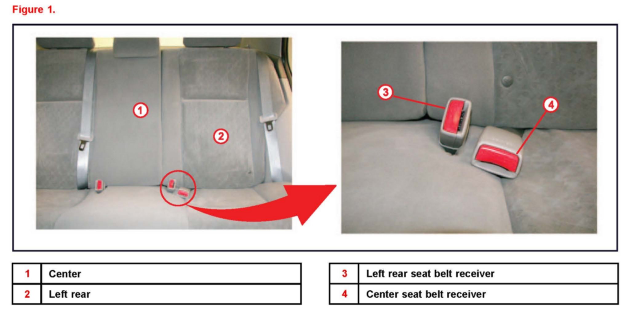 This bulletin provides additional information on the Corolla and Matrix rear seat belt assembly and its proper orientation. This information will help address any customer questions regarding the orientation of the rear seat belt assembly which includes the center and left rear seat belt receiver. Some customers think that the left rear seat belt receivers are reversed. By design the center and left rear seat belt receivers are in the correct position. (see Figure 1).