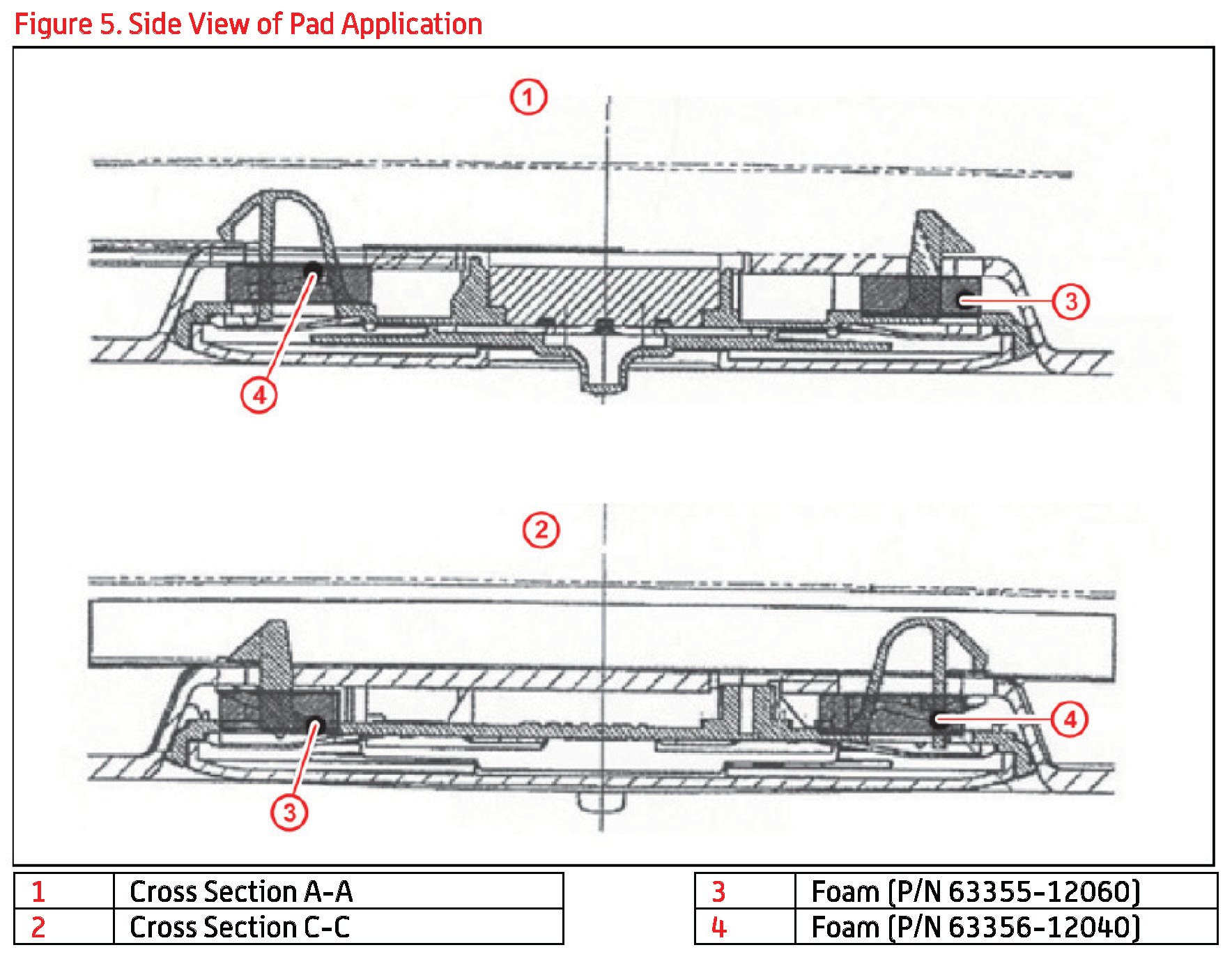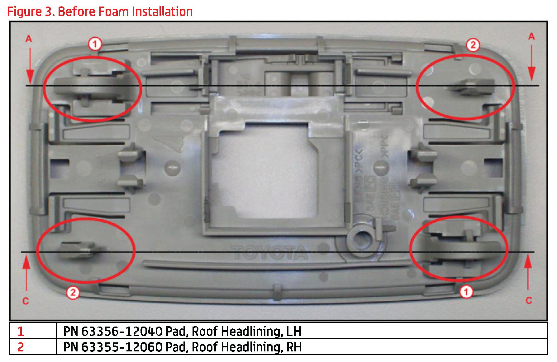 2. Place pieces of Foam (63355-12060 / 63356-12040) near the snap-fit positions of the dome lamp assembly cover as indicated in figures 1-4.