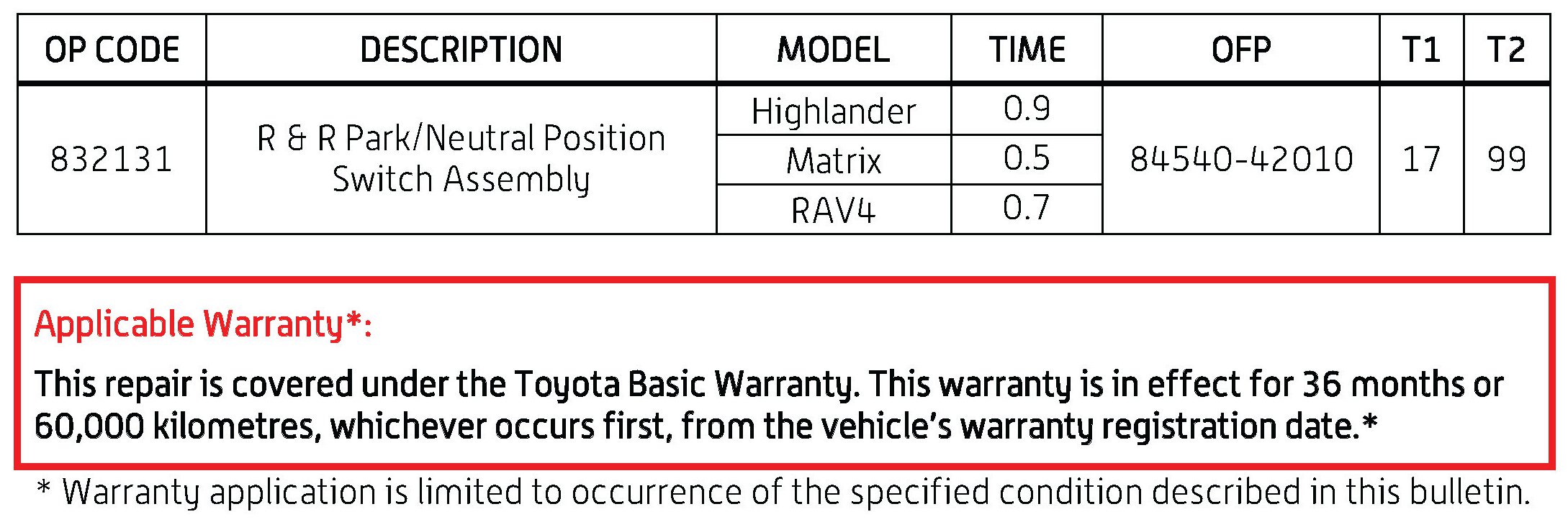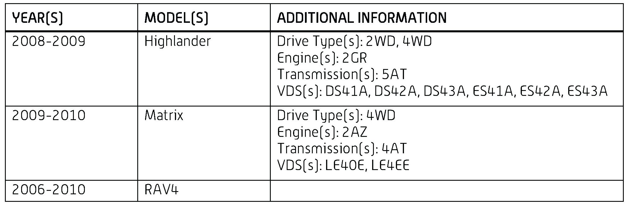 This TSB applies to all 2008 - 2009 Highlander, 2009 - 2010 Matrix, 2009 - 2010 TMMC-built RAV4, and to RAV4 vehicles produced BEFORE the Production Change Effective VINs shown.