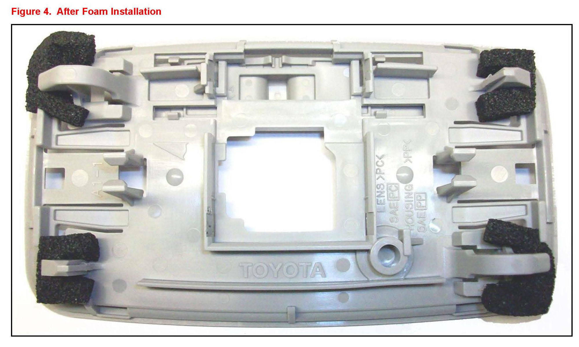 2. Place pieces of foam (PIN 63355-12060 / 63356-12040) near the snap-fit positions of the dome lamp assembly cover as indicated in Figures 1-4 below.