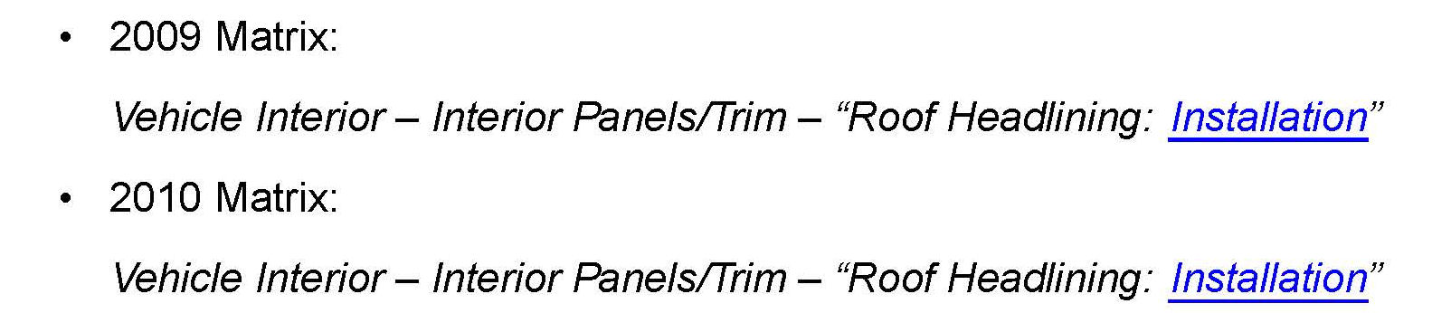 For headliner installation instructions refer to TIS applicable model year Repair Manual: