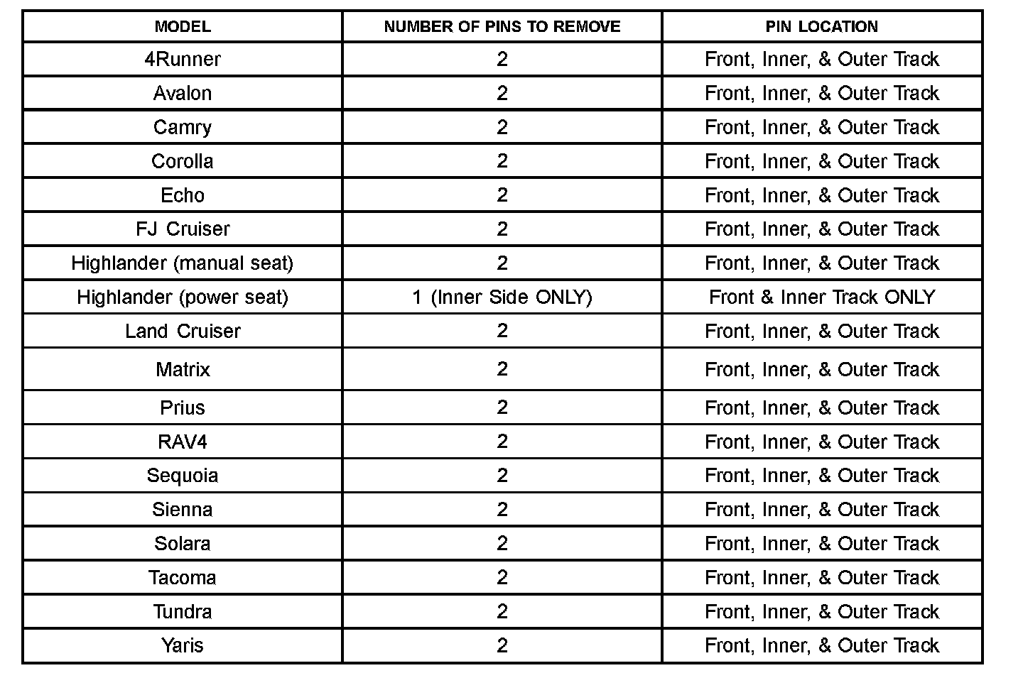 Refer to the appropriate Toyota Repair Manual for each model for detailed instructions on how to remove the plastic seat track covers.