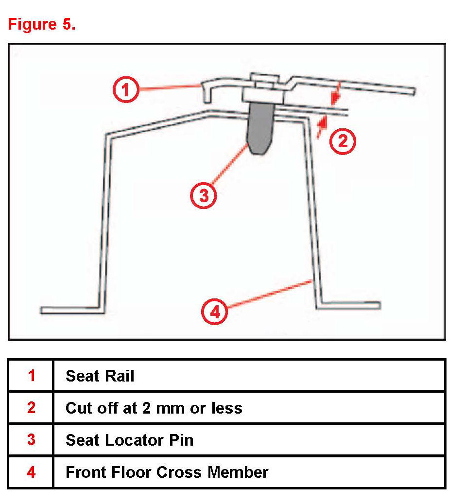 ^ Do NOT permit the power cut-off tool to contact the seat track. ONLY cut off the shaft of the pin (near the base of the seat track).