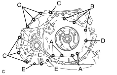 Because the bolts labeled A are seal bolts, apply FIPG to new bolts and tighten them within 10 minutes after application.