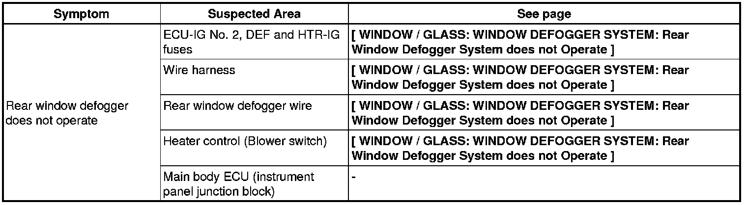 WINDOW / GLASS: WINDOW DEFOGGER SYSTEM: PROBLEM SYMPTOMS TABLE