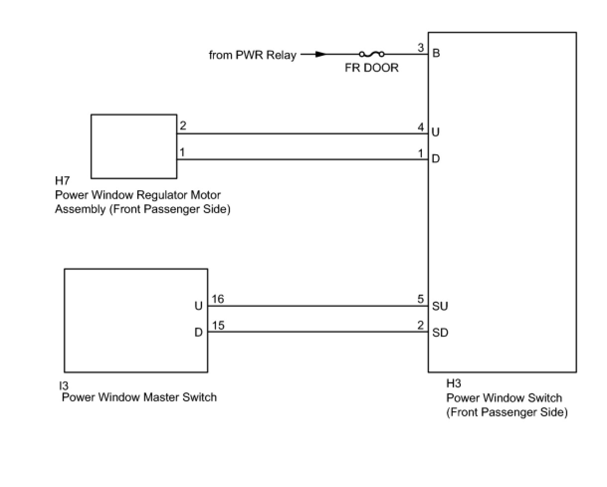 If the passenger side manual UP / DOWN function does not operate, a malfunction may exist in the power window regulator motor, power window switch, power window master switch or wire harness.
