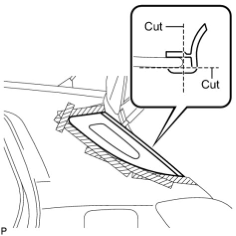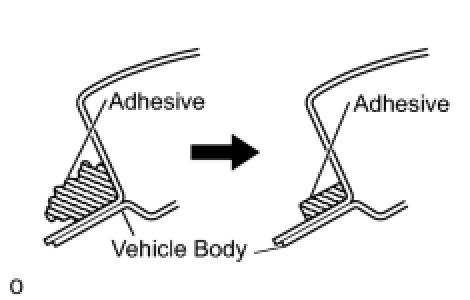 (1) Using a knife, cut away excess adhesive on the contact surfaces of the vehicle body as shown in the illustration.