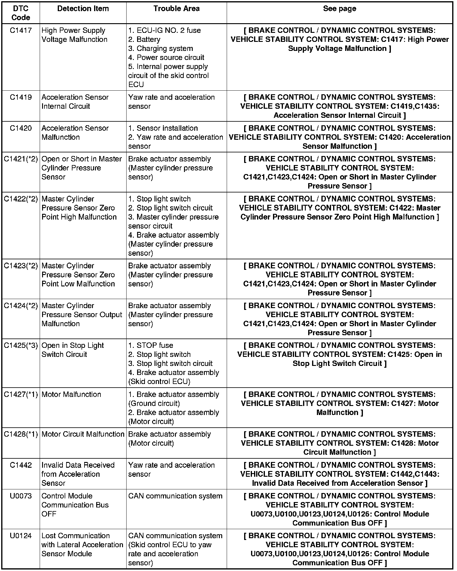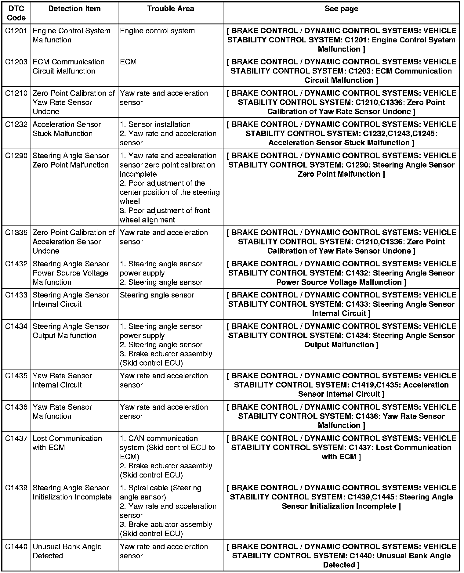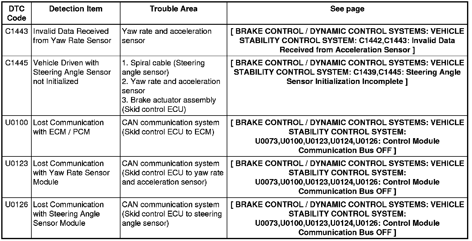 BRAKE CONTROL / DYNAMIC CONTROL SYSTEMS: VEHICLE STABILITY CONTROL SYSTEM (for 2ZR-FE): DIAGNOSTIC TROUBLE CODE CHART