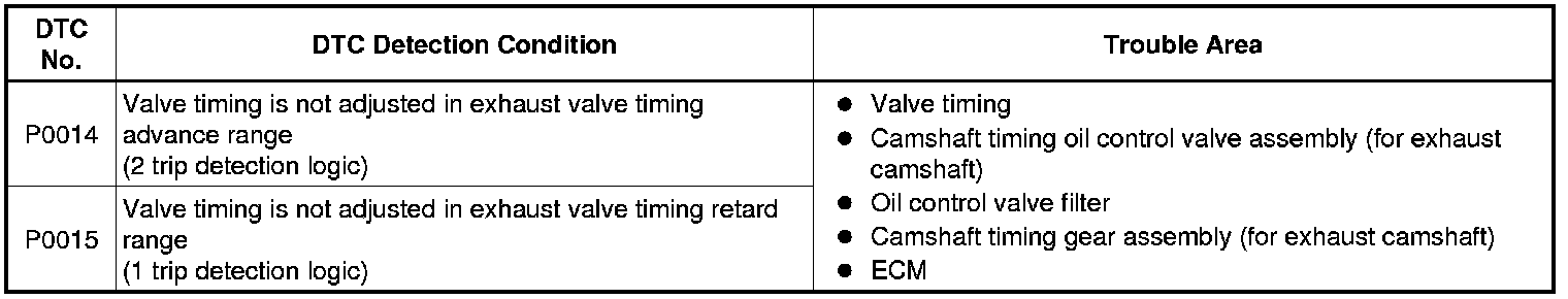 If any DTCs other than P0014 or P0015 are output, troubleshoot those DTCs first.