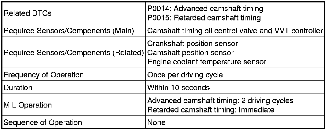 - DTC P0014 (Advanced Cam Timing) is subject to 2 trip detection logic.