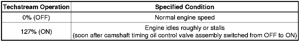 (k) Check the engine speed while operating the camshaft timing oil control valve assembly (for exhaust camshaft) using the Techstream with the engine coolant temperature is 50°C (122°F) or less.