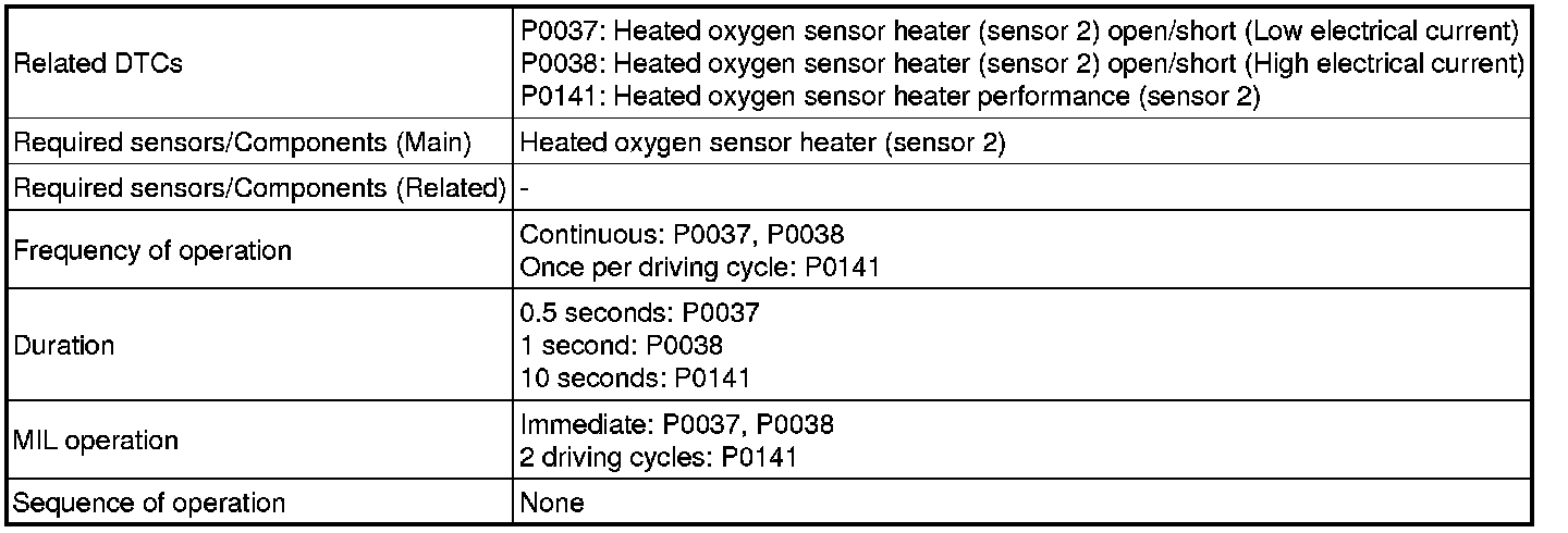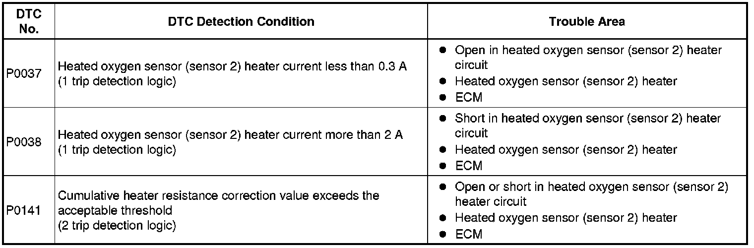 The ECM sets DTC P0038 when the current in the heated oxygen sensor heater is more than 2 A. Conversely, when the heater current is less than 0.3 A, DTC P0037 is set.
