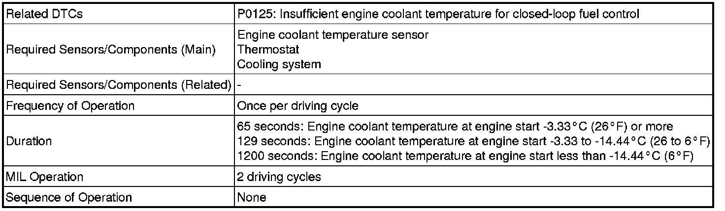 - If any of DTCs P0115, P0116, P0117 or P0118 are set simultaneously with DTC P0125, the engine coolant temperature sensor may have an open or a short circuit. Troubleshoot those DTCs first.