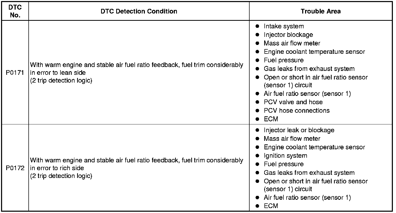 - When DTC P0171 is set, the actual air fuel ratio is on the lean side. When DTC P0172 is set, the actual air fuel ratio is on the rich side.