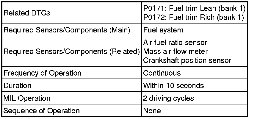 Under closed-loop fuel control, a fuel injection volume that deviates from that estimated by the ECM cause changes in the long-term fuel trim compensation value. The long-term fuel trim is adjusted when there are persistent deviations in the short-term fuel trim value. Deviations from the ECM estimated fuel injection volume also affects the average fuel trim learning value, which is a combination of the average short-term fuel trim (fuel feedback compensation value) and the average long-term fuel trim (learning value of the air fuel ratio). If the average fuel trim learning value exceeds a malfunction threshold, the ECM interprets this a fault in the fuel system and sets a DTC.