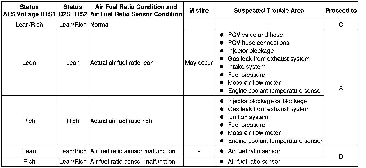 Rich: During Control the Injection Volume for A/F Sensor, the AFS Voltage is consistently less than 3.1 V, and the O2S is consistently more than 0.55 V.