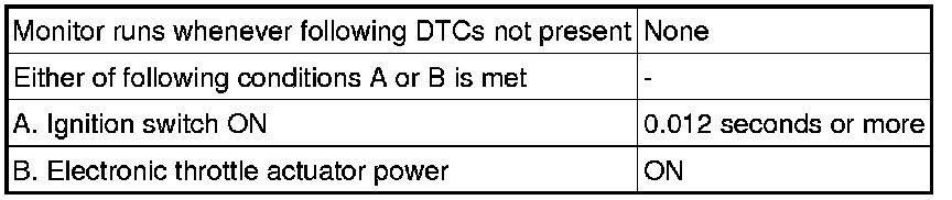 For each throttle opening angle, a specific voltage difference is expected between the outputs of VTA1 and VTA2. If the output voltage difference between the two signals deviates from the normal operating range, the ECM interprets this as a malfunction in the TP sensor. The ECM illuminates the MIL and stores the DTC.