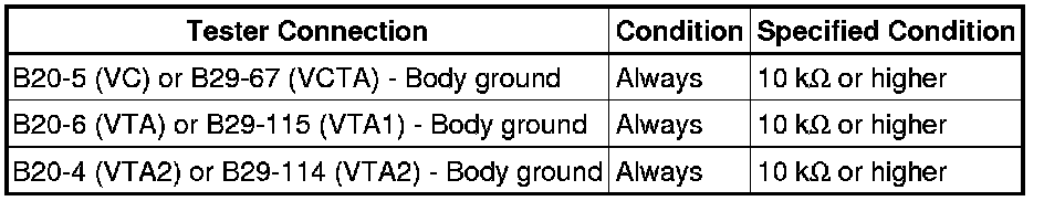 The throttle position sensor has 2 sensor circuits, each of which transmits a signal, VTA1 and VTA2. VTA1 is used to detect the throttle valve angle and VTA2 is used to detect malfunctions in VTA1. The sensor signal voltages vary between 0 V and 5 V in proportion to the throttle valve opening angle, and are transmitted to the VTA terminals of the ECM.