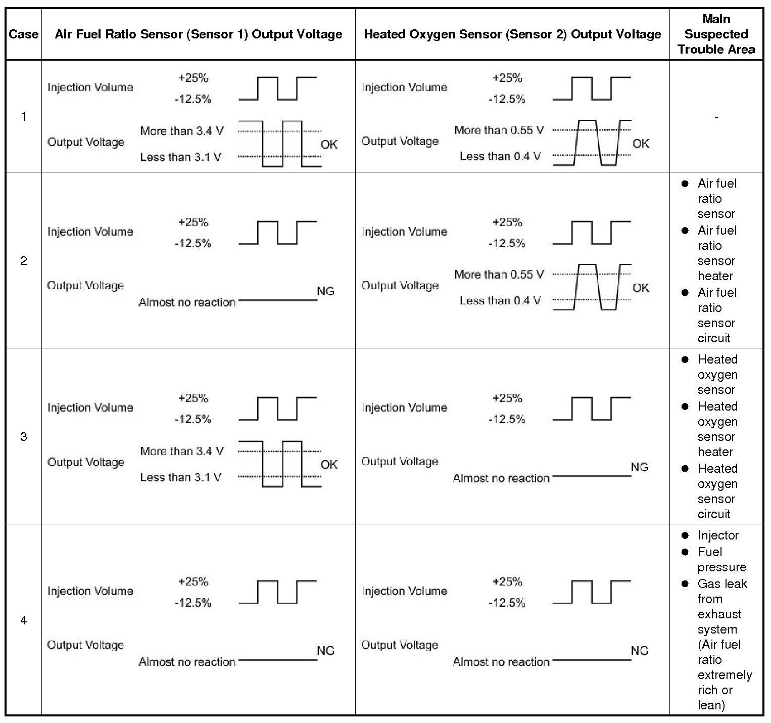 * Following the Control the Injection Volume for A/F sensor procedure enables technicians to check and graph the voltage outputs of both the air fuel ratio and heated oxygen sensors.