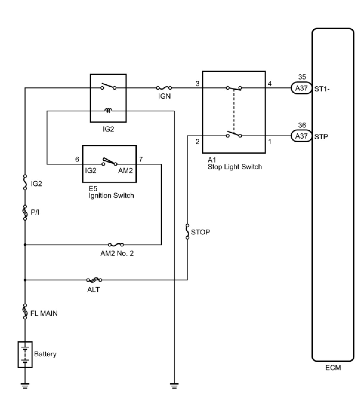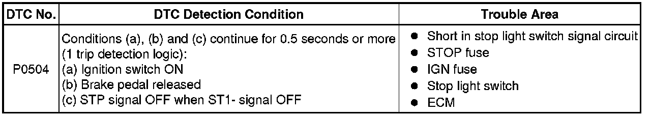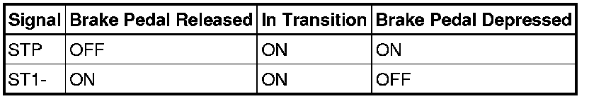 The stop light switch is a duplex system that transmits two signals: STP and ST1-. These two signals are used by the ECM to monitor whether or not the brake system is working properly. If the signals, which indicate the brake pedal is being depressed and released, are detected simultaneously, the ECM interprets this as a malfunction in the stop light switch and sets the DTC.